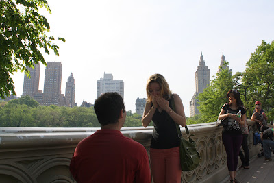 We continued walking up to and through Central Park. She kept asking if we could just sit down and enjoy the weather, but I was on a strict schedule, so I politely said we just had a little farther to go. We finally got to the little lake in the middle of the park. There were people rowing in boats, and I could tell she wanted to go so I said maybe we could get one. We made our way around to the lake to the final spot – Bow Bridge. I asked her to stand by the rail and I would take her picture with the city in the background. The was necessary because I had to make sure the camera was in focus (it’s a Canon Rebel, not a little point and shoot) for whomever I was going to get to take our picture. Once I was pleased with the shot, I looked for someone to take our picture. There were two couples talking beside me, looked to be in their early 50’s, so I asked one of the women if she would take our picture. To my surprise, she said no! She said she would probably ruin it, laughed, and said that her husband would though. I gave him the camera, and as I’m walking over to Sara, I’m reaching into the bag to pull the ring box, but all I’m finding is the front of my shoes. When I had put the box in the shoes, which were in the front of the bag, the bag was on my left shoulder. But now the bag was on my right shoulder so everything was reversed. I figured it out just as I was coming up to Sara and setting the bag down, but I got the box out in time. Unfortunately, for all my months and months of planning, I had thought of everything EXCEPT what I was going to do at that exact moment. And I froze. The gentleman snapped a picture and was bringing us the camera when I asked if he would take one more. I then gave Sara a squeeze with the arm I had around her, told her “I love you so much,” and got down on a knee. She screamed.
