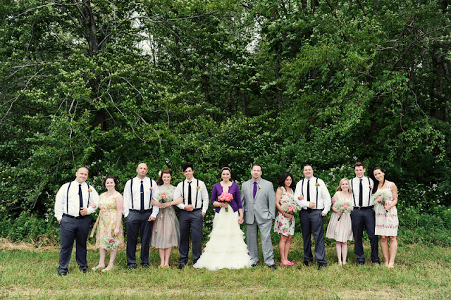 This wedding was DIY (including the florals!) from head to toe, if a wedding has a head and a toe. And it proves that rain doesn’t ruin your wedding day. In fact, it could make it better! Pretty pink peonies, a pink and purple palette, sparkly Toms, fantastic vintage elements, mismatched bridesmaids, mason jar beverage glasses, the bride’s cardigan…I just love so many things about this wedding. LOVE LOVE LOVE!